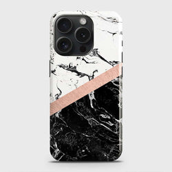 - iPhone 15 Pro Cover - Black & White Marble With Chic RoseGold Strip Case with Life Time Colors Guarantee