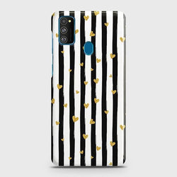 - Samsung Galaxy M30s Cover - Trendy Black & White Lining With Golden Hearts Printed Hard Case with Life Time Colors Guarantee