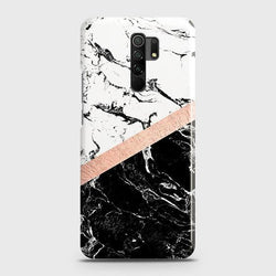 - Xiaomi Redmi 9 Cover - Black & White Marble With Chic RoseGold Strip Case with Life Time Colors Guarantee
