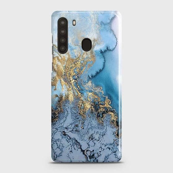 Samsung Galaxy A21 Cover - Trendy Golden & Blue Ocean Marble Printed Hard Case with Life Time Colors Guarantee
