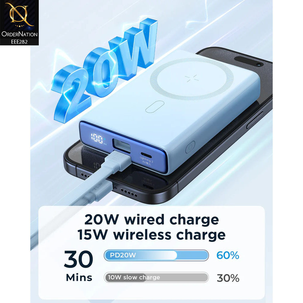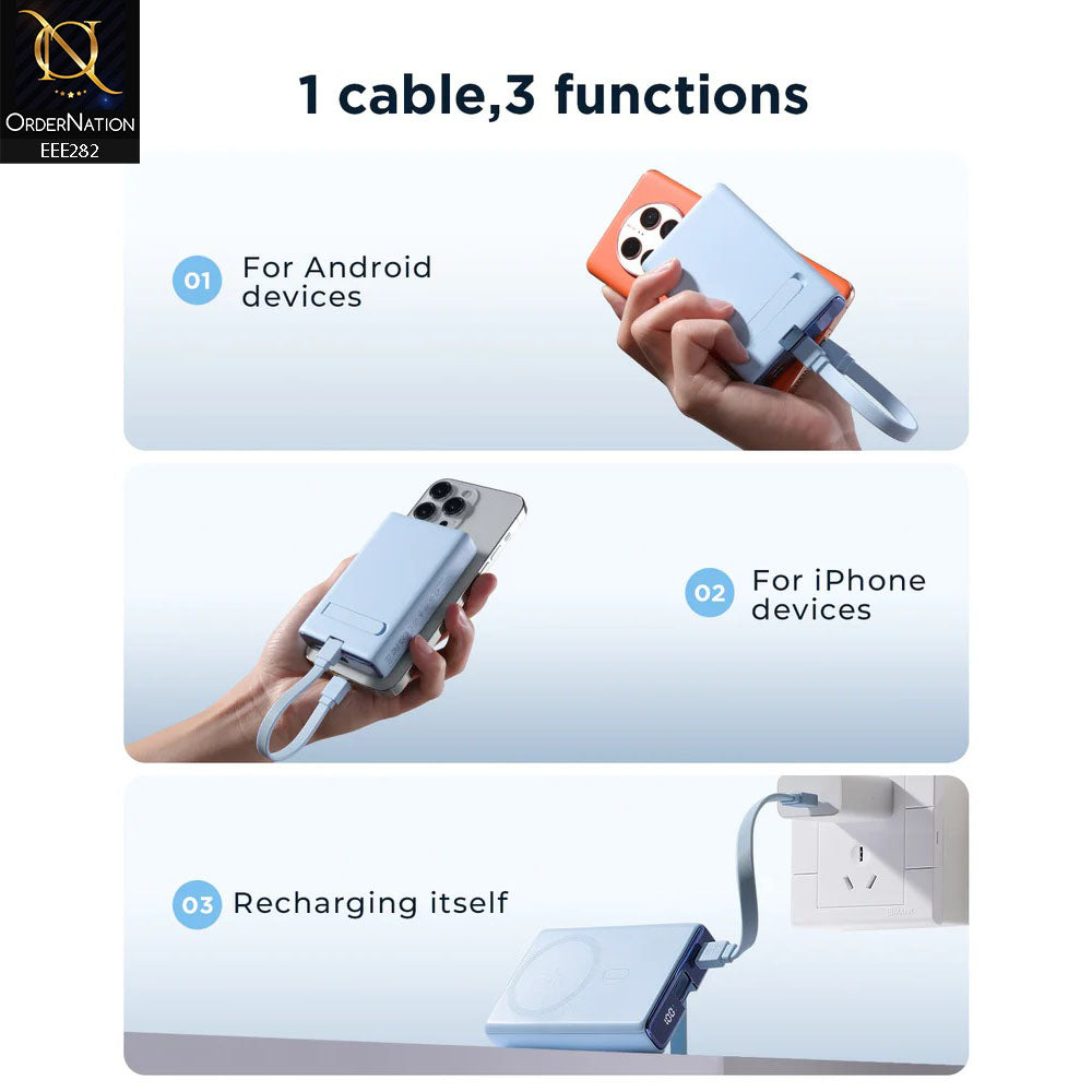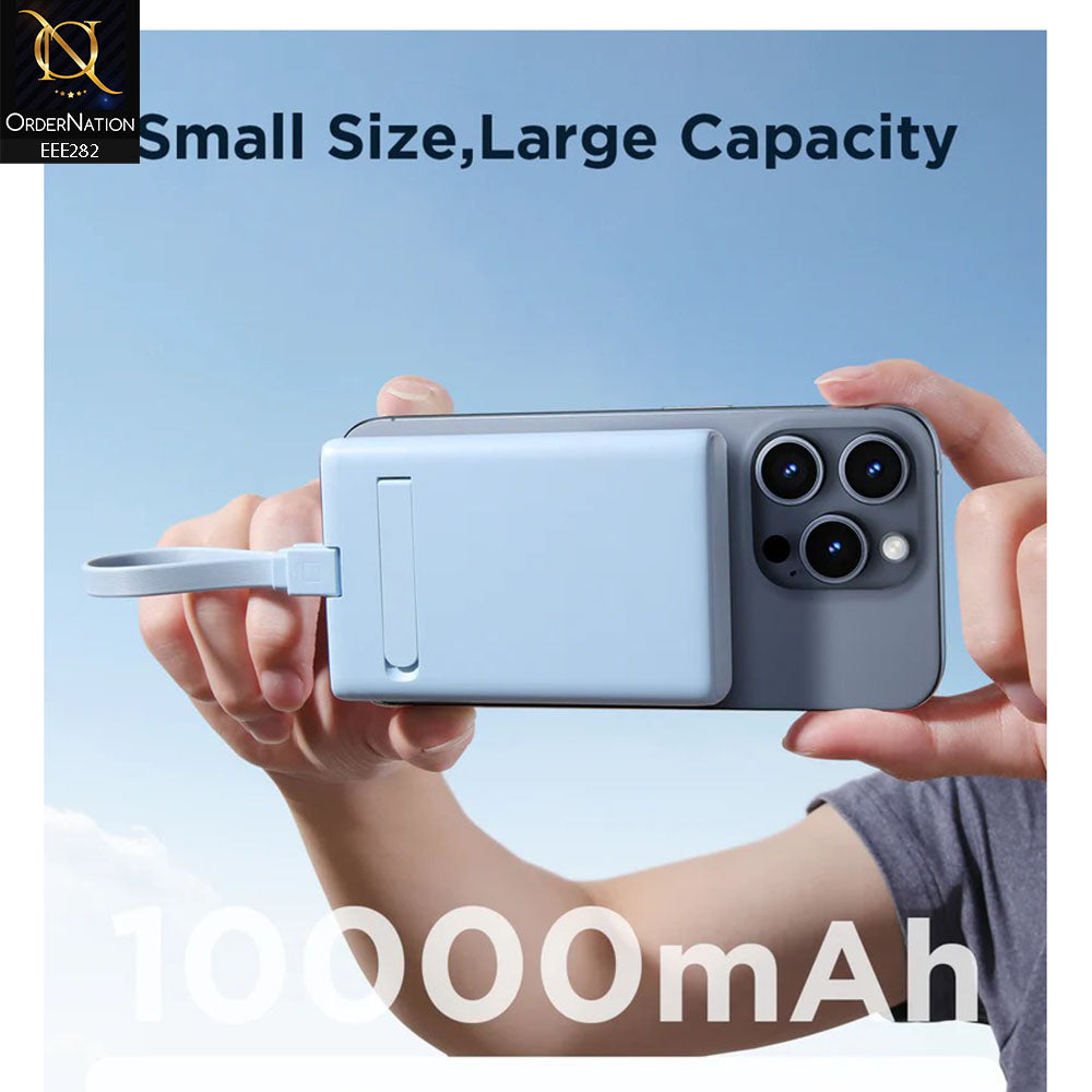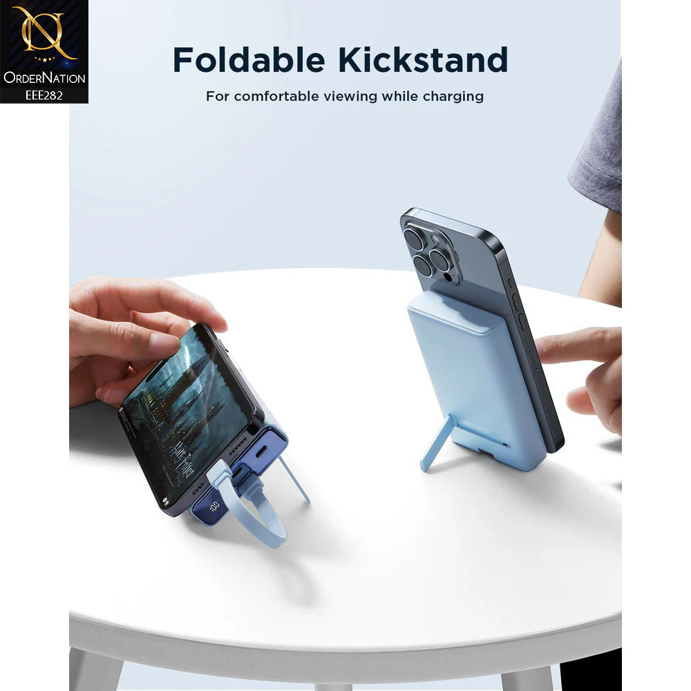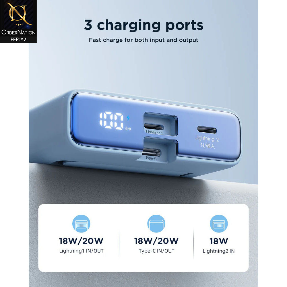 Joyroom introduces the JR-PBM01 20W Power Bank, a compact yet powerful companion for your devices. It has a robust 10000mAh Lithium Polymer Battery and supports fast charging with Type-C and dual Lightning inputs. Equipped with a detachable cable and a convenient kickstand, it ensures versatile charging and comfortable viewing on the go. The sleek design includes a digital display for battery status and wireless charging capability, making it essential for efficient and safe power solutions.