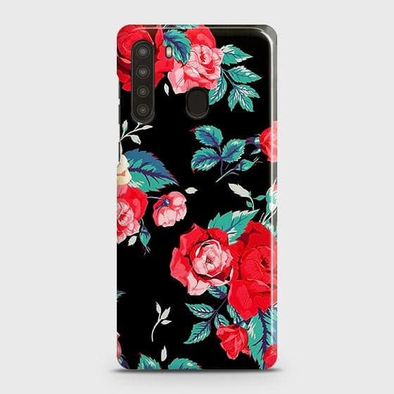 Samsung Galaxy A21 Cover - Luxury Vintage Red Flowers Printed Hard Case with Life Time Colors Guarantee