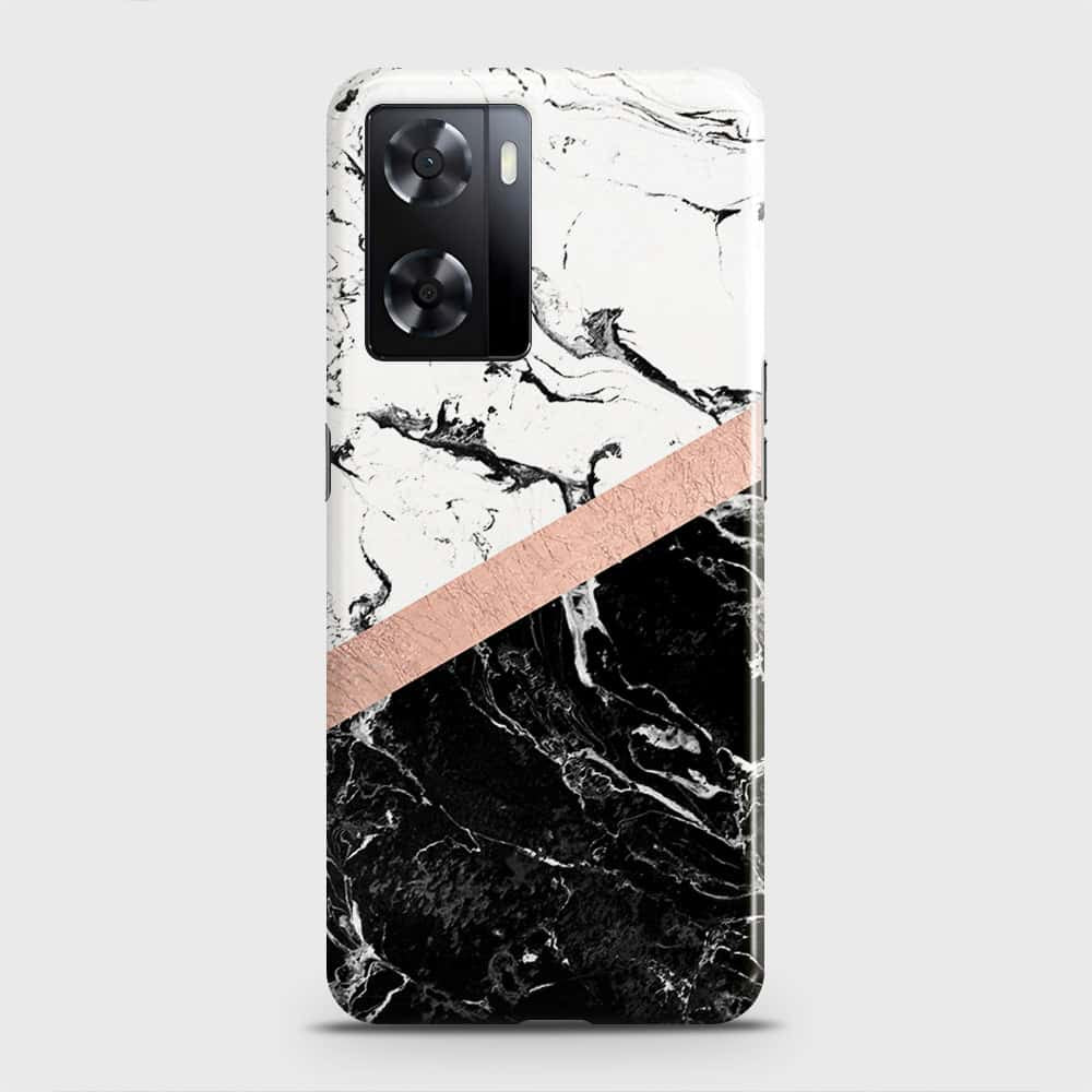 Oppo A57 4G 2022 Cover - Black & White Marble With Chic RoseGold Strip Case with Life Time Colors Guarantee