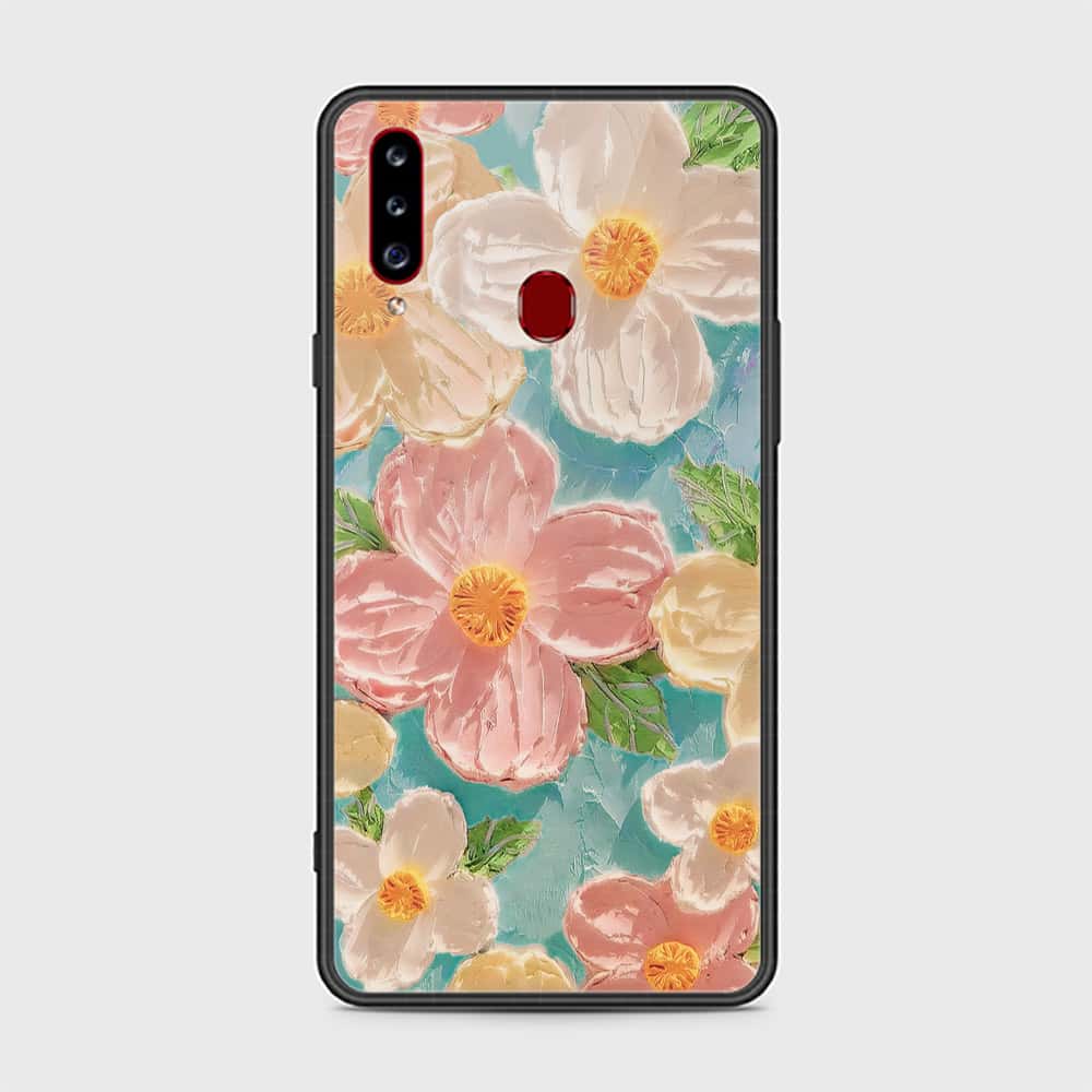 Samsung Galaxy A20s Cover - Floral Series - Design 16 - Cyan & Pink - HQ Ultra Shine Premium Infinity Glass Soft Silicon Borders Case