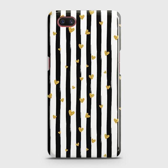 Realme C2 with out flash light hole Cover - Trendy Black & White Lining With Golden Hearts Printed Hard Case with Life Time Colors Guarantee