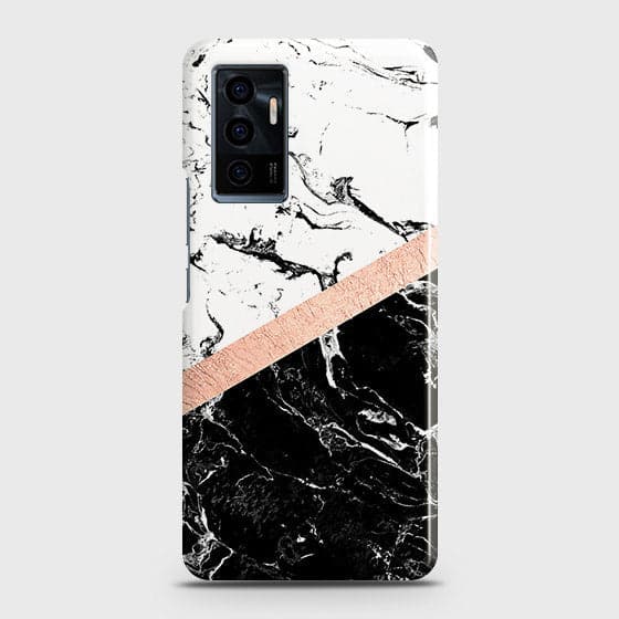 Vivo V23e Cover - Black & White Marble With Chic RoseGold Strip Case with Life Time Colors Guarantee