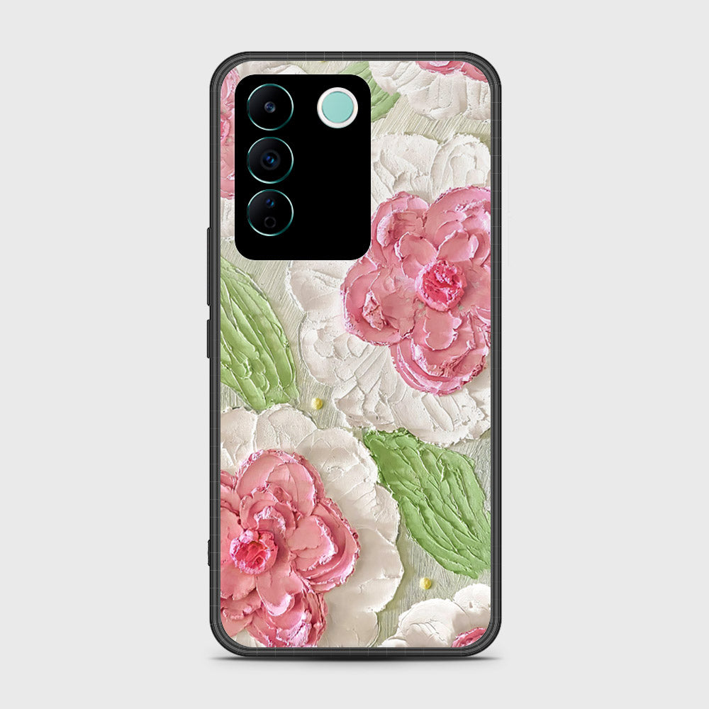 Vivo V27e Cover - Floral Series - Design 13 - Offwhite & Green - HQ Ultra Shine Premium Infinity Glass Soft Silicon Borders Case