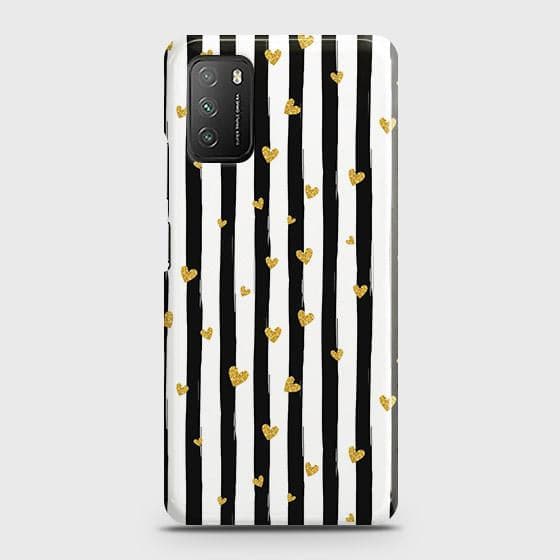 Xiaomi Poco M3 Cover - Trendy Black & White Lining With Golden Hearts Printed Hard Case with Life Time Colors Guarantee